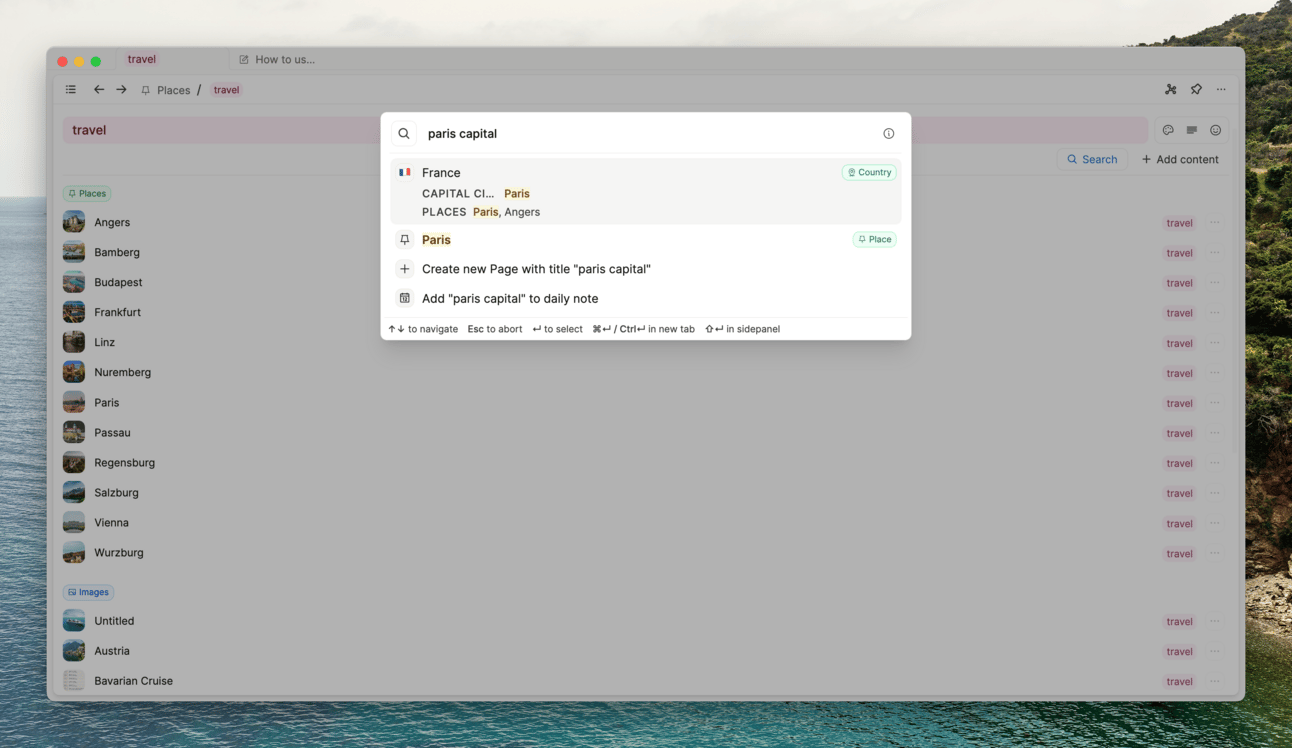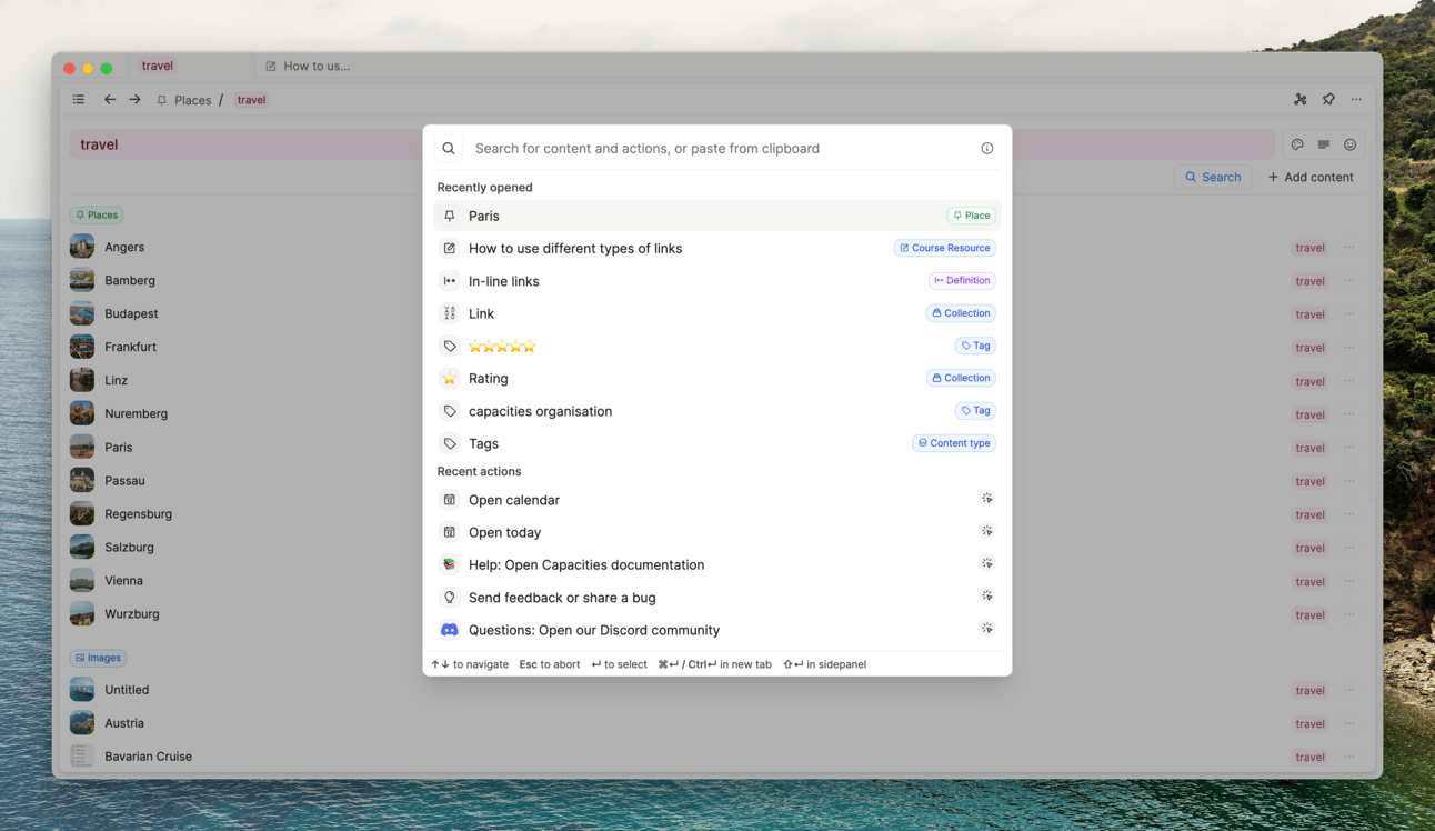 This is a powerful, quick, and effective way of navigating your Capacities account. You can use it to search for content across your space and it handily labels each search result with the object in which the content belongs to help you scan results faster. You can also use it to search for property values. This is great for quick reference.