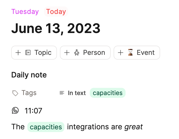 Currently there are integrations with email, Twitter, Telegram, WhatsApp and Hookmark which allow you to add content to Capacities very easily, and in a way that suits your workflows. This flexibility is great.