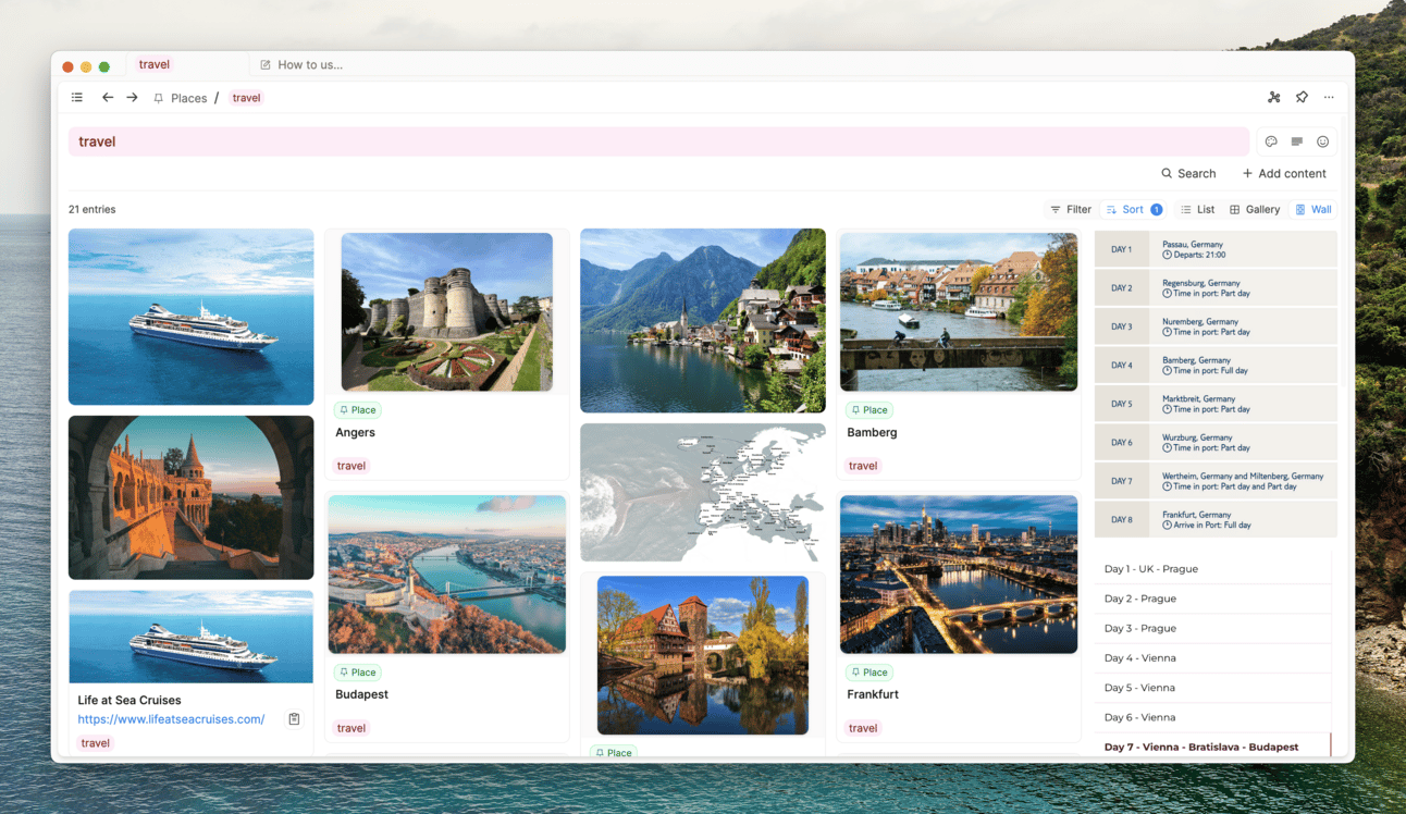 You have the classic table, list and gallery view, but there is the amazing wall view which is a more natural “moodboard” effect that reacts to the amount of content in each page. This is great for getting a visual overview of your content, and it’s formatted in such a way that you can see some content without having to open the page which is great for added context and quick reviews.