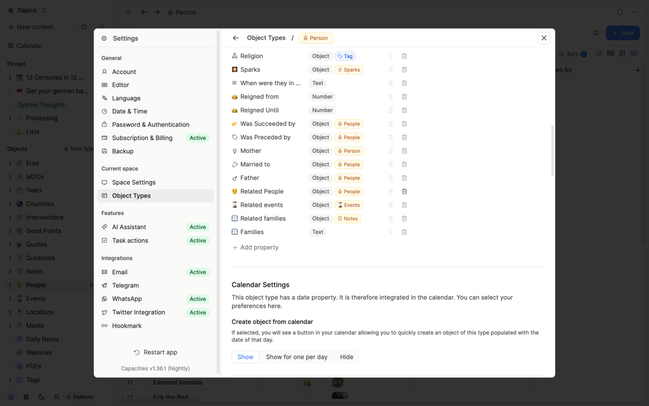Capacities works in object types. They’re groups of content. But if I had an object type for every group, my sidebar would be too long. Crucially it would also take me ages to set up, and in reality a lot of the properties would be the same in each. So I just use one object type. I could use pages (built in), but I like to add properties, so I need a custom object type. That’s when notes were born.