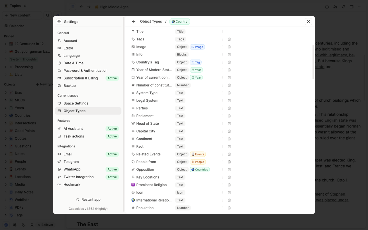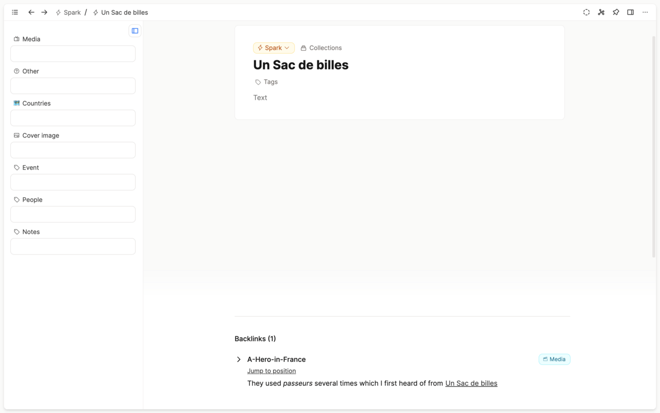 Once it’s summarised, I can link to other objects. Because I’m in Capacities and we deal in types, I set up a few object types that group the types of ~things~ I noticed my sources were telling me about