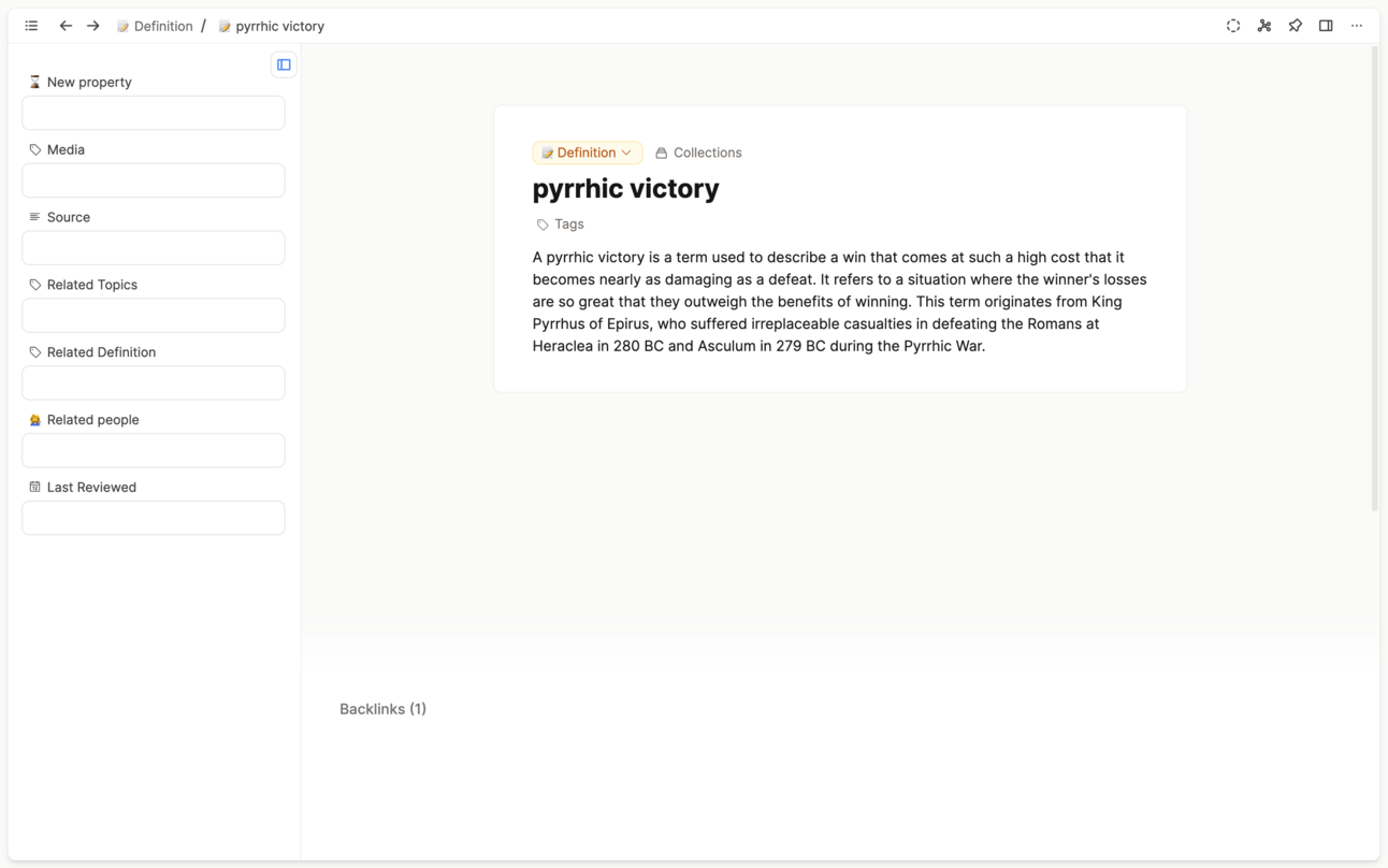 Because of this, I just want to be able to draw a line between what I'm learning and where that history happened. In that way, I think of it as an entity- something to be linked to- rather than a place for me to take notes. This is different to a lot of my other object types where really the end goal is words on the page. I will show this in action in my long note-taking video.