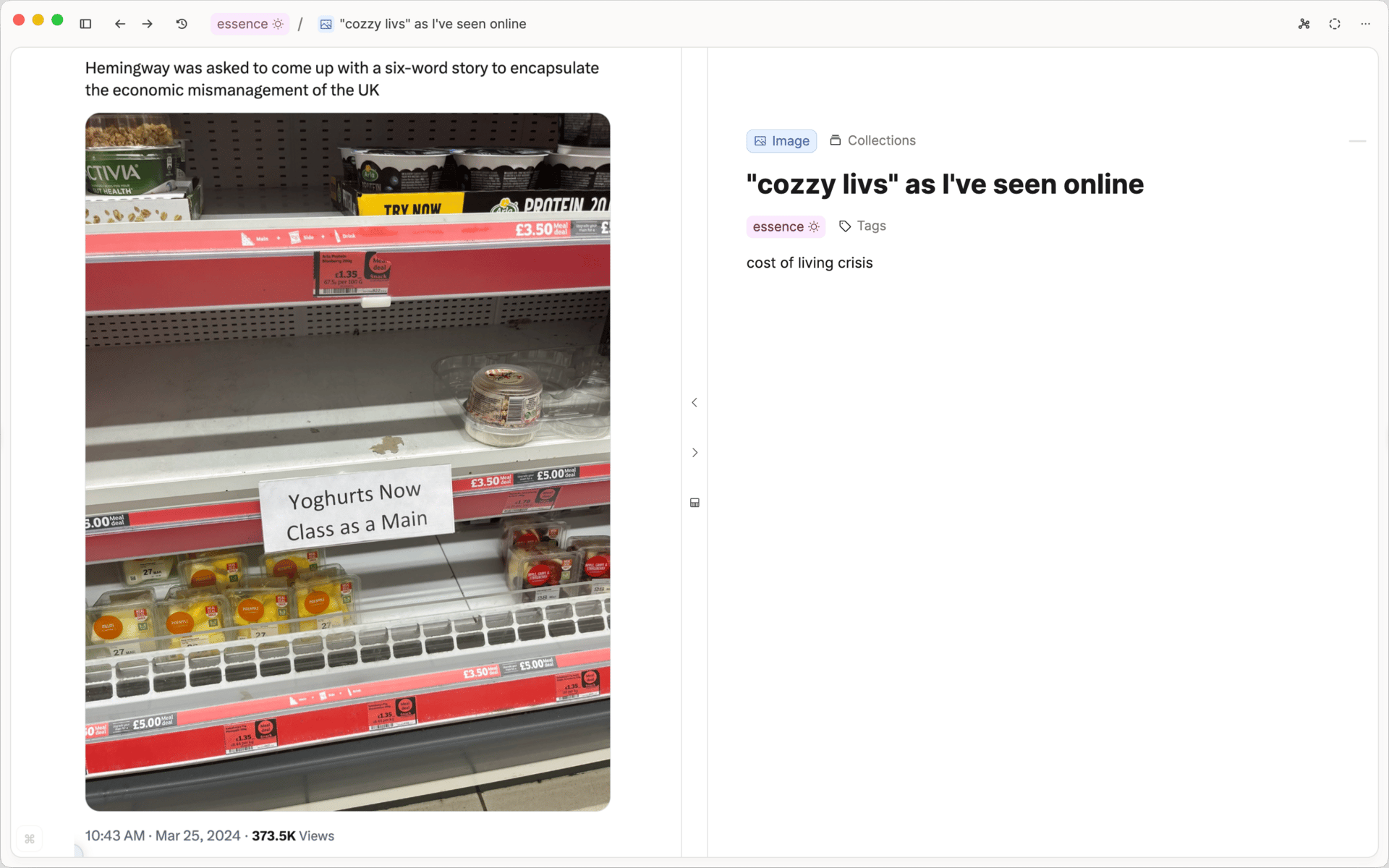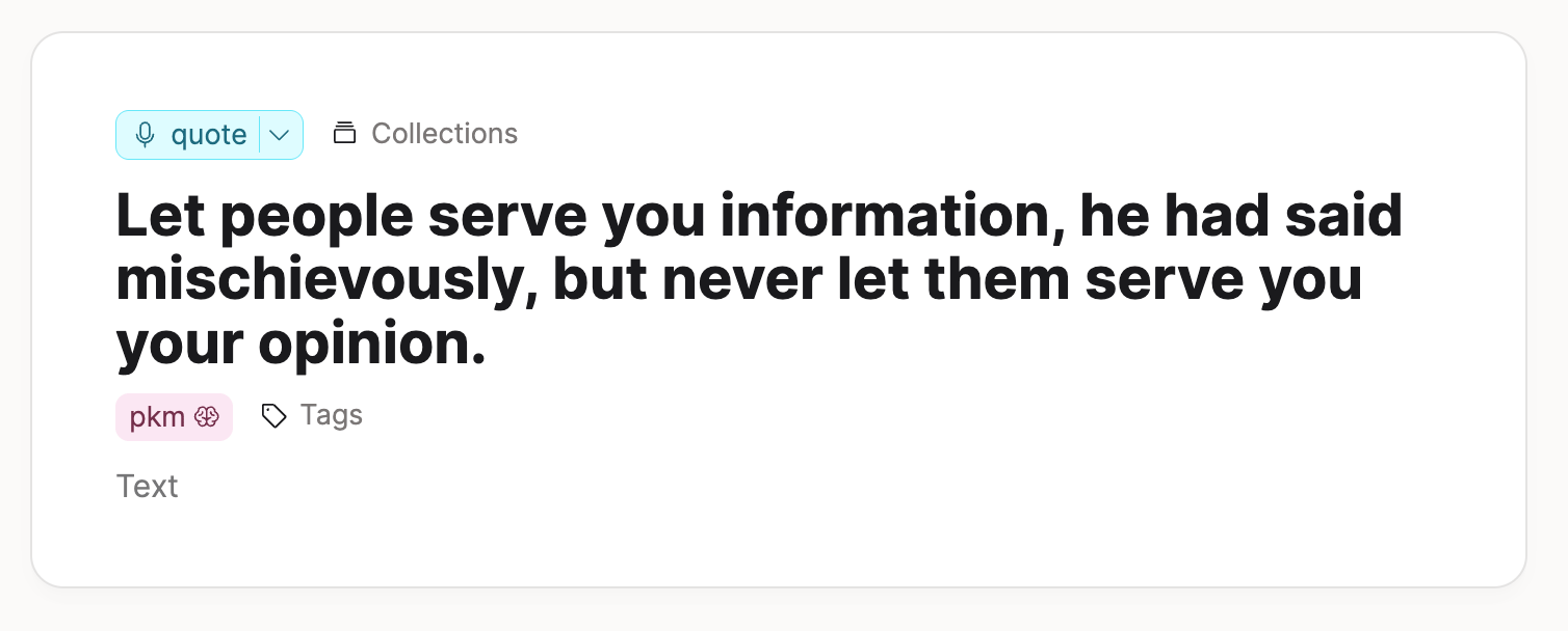 A huge part of why I use a note-taking app is to take information from the outside world and work out my opinions on it. It helps craft my values, the mental models I use every day and how I want to approach the world.