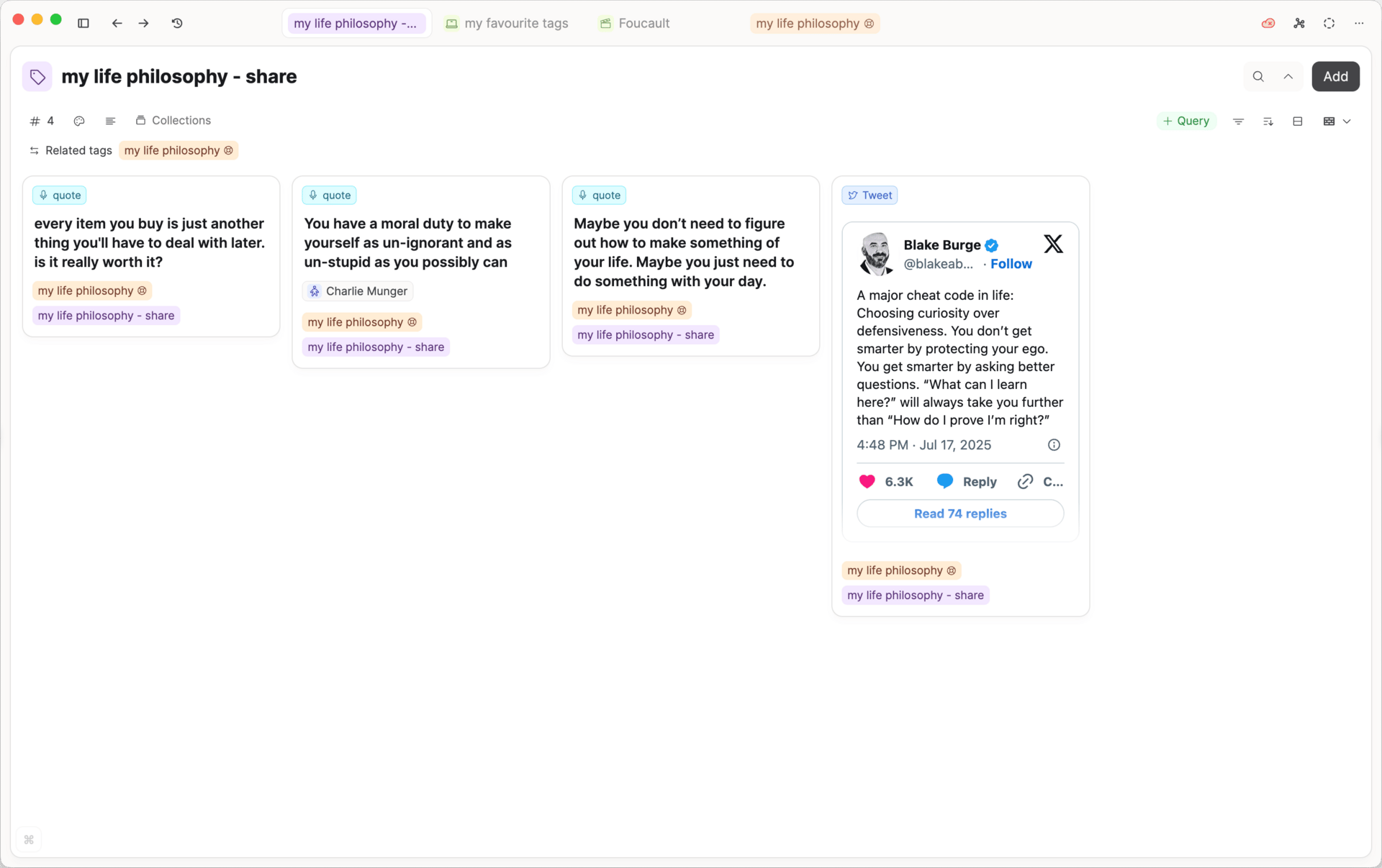 I mostly use Capacities tags to signal what topics are discussed in a block or note, so I can find and review them alongside similar content. But I also use a range of tags that aren’t about topics. Instead, they gather things under fun or reflective headings.