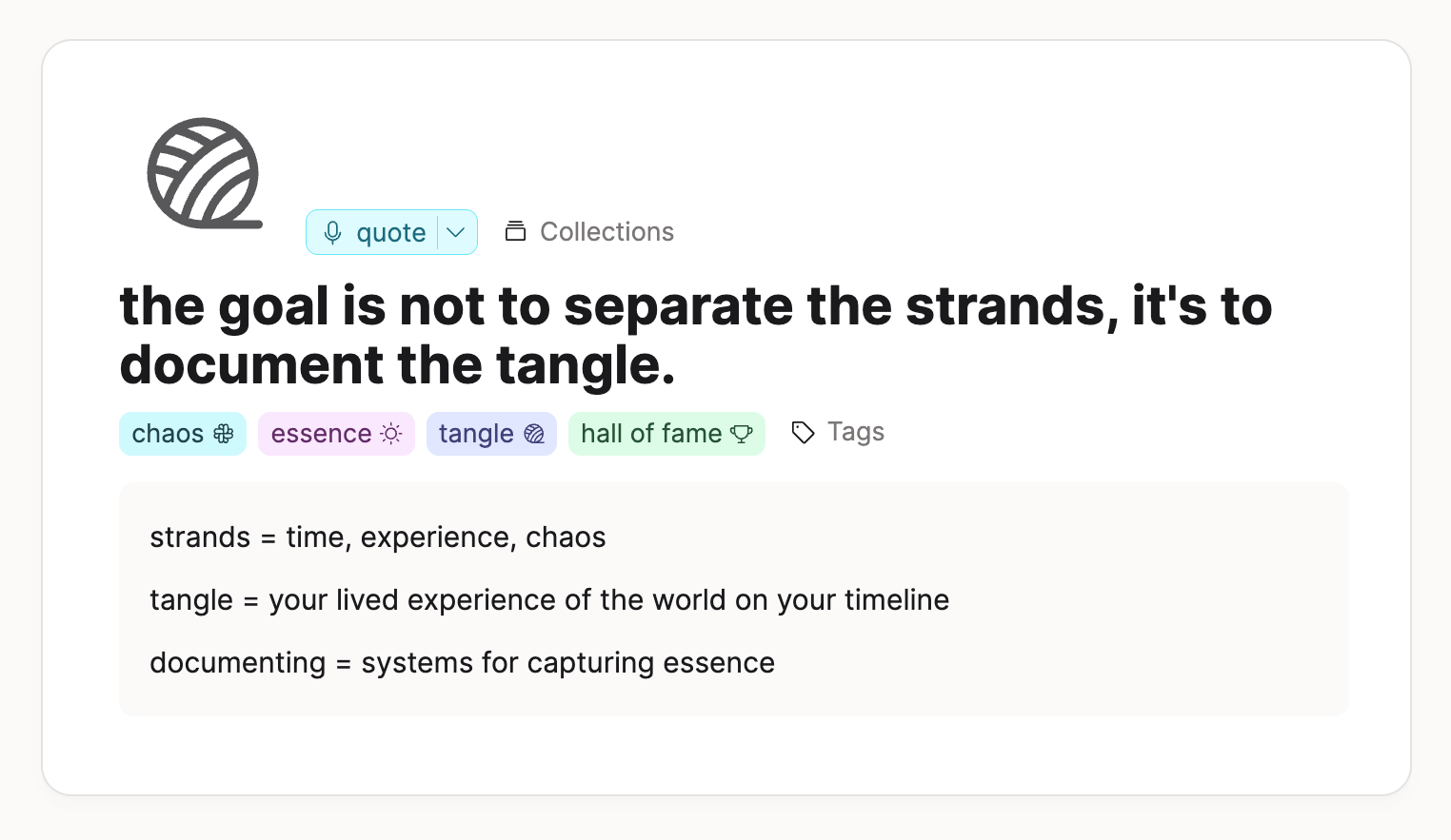 I’ve been doing this longer than I’ve used Capacities, so I have a variety of practices around it, but in Capacities I simply have a tag that collects everything. I scan through it often, and enjoy the journeys it takes me on.