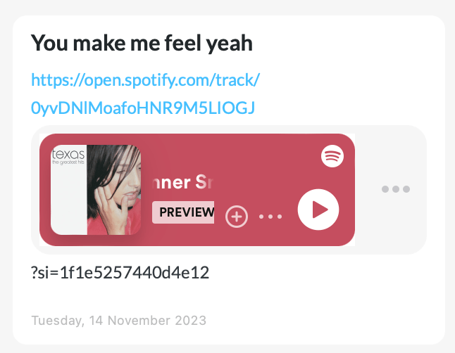 Just pasting the song link into Day One gives it a nice embedded look (bringing colour and sound in) and I can still write down my thoughts.