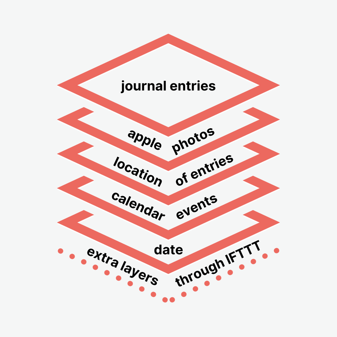 For example, I mentioned layers in my digital system video. I talked about how I like Day One because it integrates with my photos, locations and calendar, which I now view as layers of information on top of the date, and then of course my journal entries are themselves another layer of information, and the words (and my experience of a day) can be moulded or even just evidenced by the content in the other layers. A day full of meetings might explain why I have so many ideas to work on, or a day where I wore a nice outfit might explain why I feel more confident which might have affected other things in my day, my location being somewhere other than home explains why my journal entry is something different to normal... it’s all making up a bigger picture.