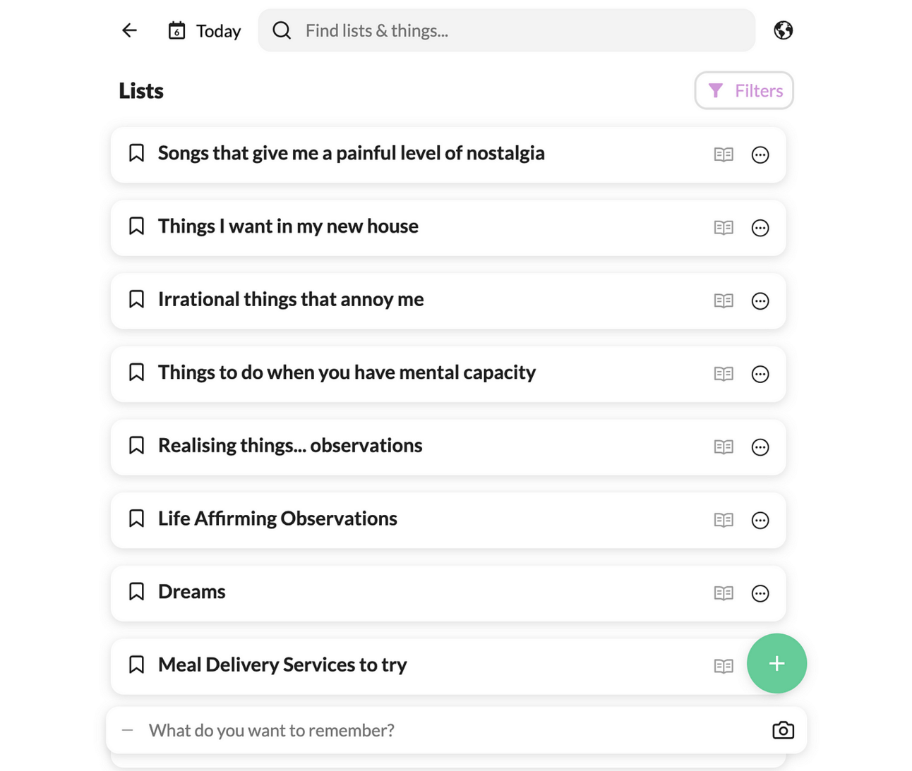 I make lists all the time but they’re just for holding random things, things that make me happy, things that I want to do nothing with but casually review at some point in the future etc. They don’t normally need expansion or further connection. But every other tool in my system is geared towards action or reflection. These aren’t tasks and they’re not journal entries. There just things. This is, conveniently, how Twos markets itself. A place for things.